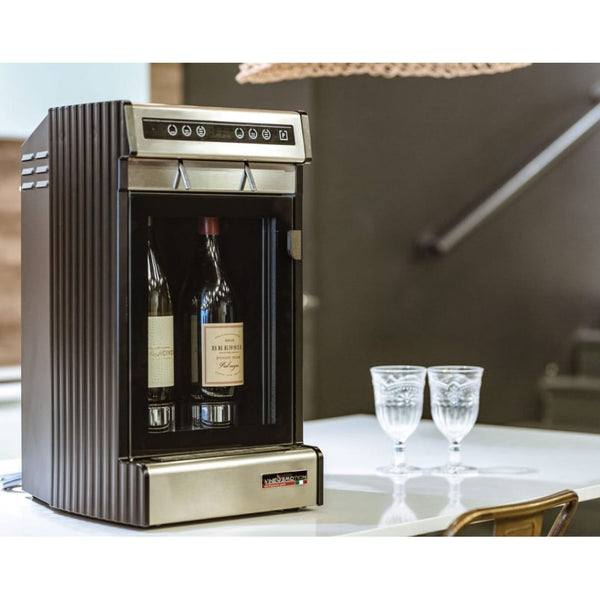 Wineemotion Mia is a refrigerated wine dispenser. It preserves wine by filling the bottle with food-grade argon gas. It uses a special tap that pours a precise amount of wine while keeping oxygen away from the wine.